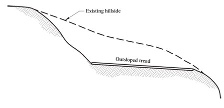Trail grade and slope matter are some of the key factors in combating erosion. Trail grade is like the steepness of a trail: when going up or down a hill, you are experiencing changes in the trail’s grade. The slope of the trail, specifically the outslope, is like the tilt of the trail. It is the slope of the trail between the side of the hill it runs against and the bottom of the hill.4 To have durable trails, builders must take the combination of the two slopes to ensure water does not gather or pool on the trail, preventing soil runoff.